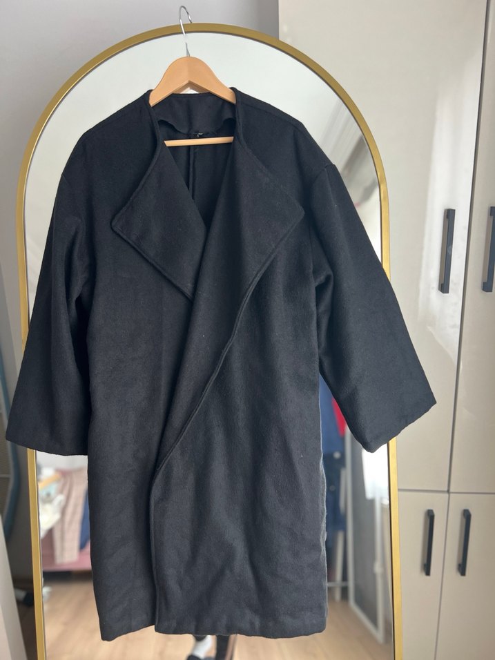 Geniş yakalı, rahat kesim siyah oversize kaban. Yumuşak ve sıcak dokusu ile serin havalar için uygundur. Kaşe kumaş 1 kez giyildi #kaşekaban Oversize 36-40 beden