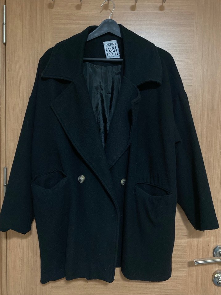 Standart beden Siyah oversize kaban, geniş yakalı ve iki ön ceplidir. Çift düğmeli kapama ve düzgün astar içerir.