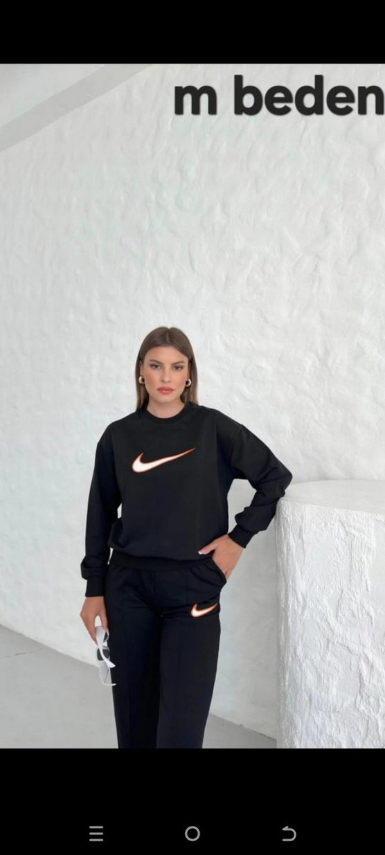 Siyah renkli, oversize kesim kadın eşofman takımı, uzun kollu ve bisiklet yaka. Yumuşak ve sıcak kumaştan, sportif logo detayıyla rahat sokak stili için ideal. Elimde üründen 2 adet var.
