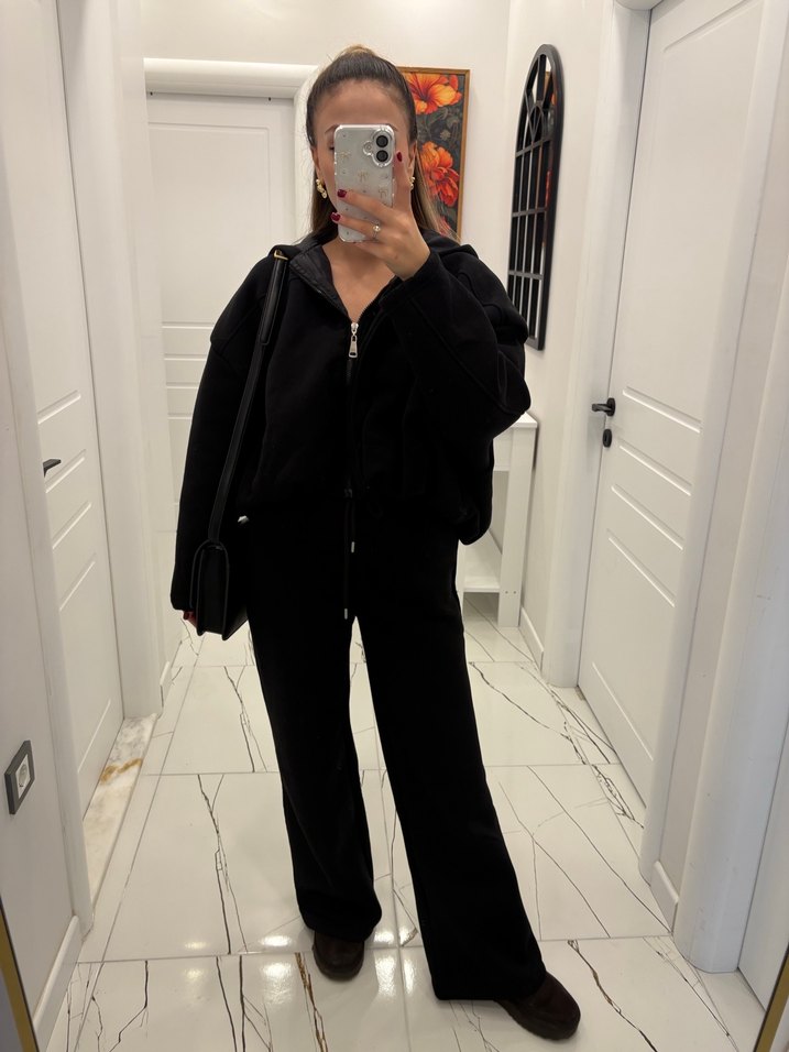 Astarlı polarlı Yüksek yakalı, uzun kollu, siyah oversize eşofman takımı, yumuşak ve sıcak kumaştan, günlük rahat kullanım için uygundur.