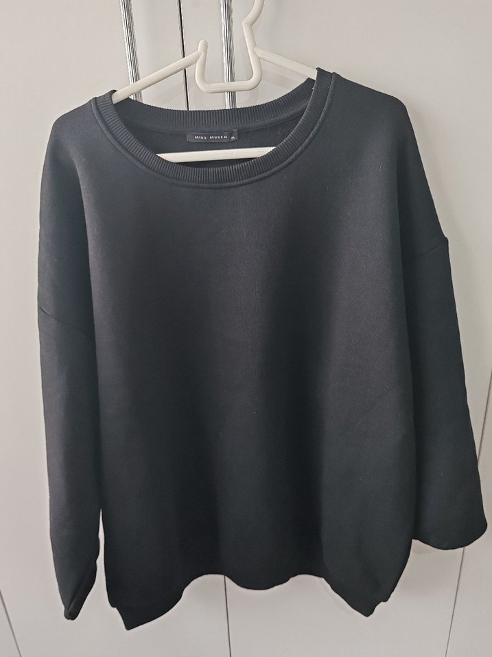 Siyah, yuvarlak yaka, uzun kollu, bol kesim ve normal boyda sweatshirt. Yumuşak ve sıcak kumaştan, rahat ve sade stil için uygundur.