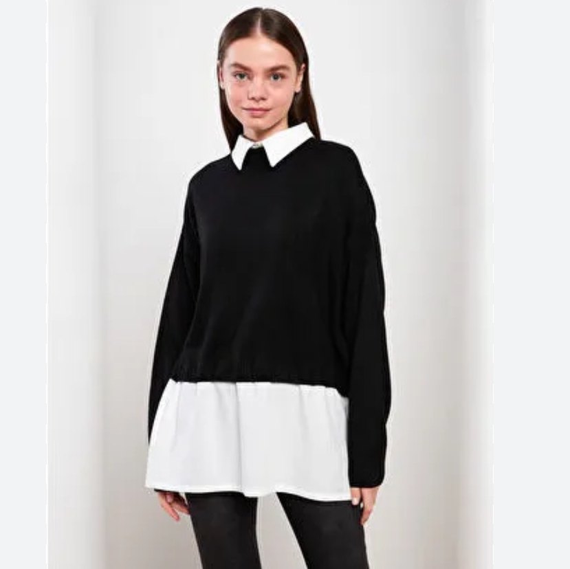 Siyah, pamuk kumaştan, oversize kesim ve uzun kollu, yuvarlak yakalı sweatshirt. Günlük kullanıma uygun, rahat ve şık midi uzunlukta.l xl uyum