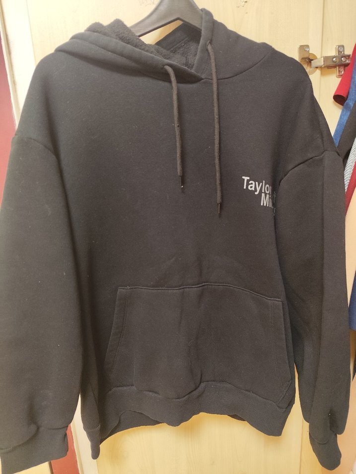 Siyah renk, oversize kesim kapüşonlu sweatshirt. Uzun kollu ve ön cepli, yumuşak ve sıcak dokulu kumaştan yapılmıştır. Üzerinde 'Taylo' baskısı bulunur.