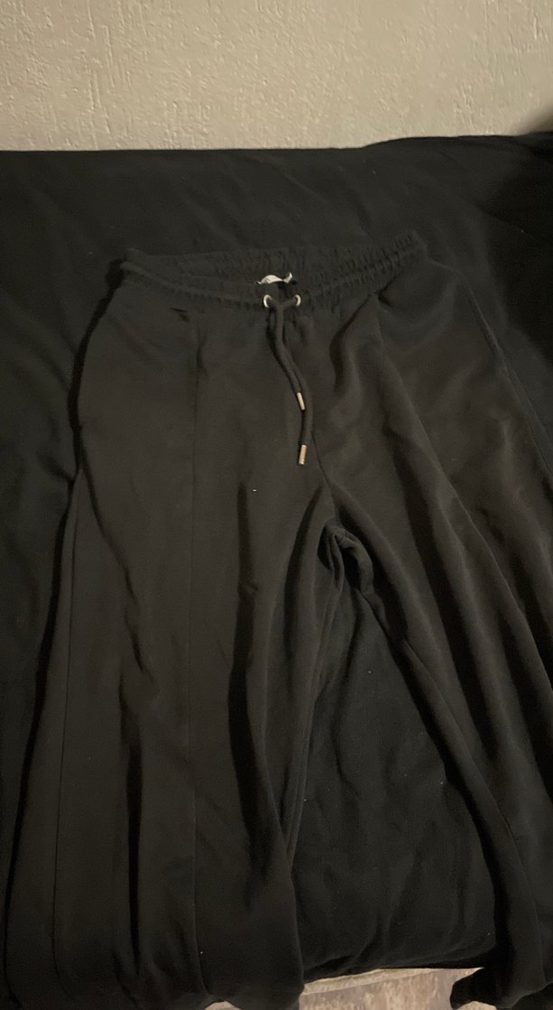 Siyah, bol kesim, midi boy kumaş pantolon. Belinde bağcıklı, rahat ve şık sokak stili için uygun, sentetik yumuşak kumaştan yapılmıştır.