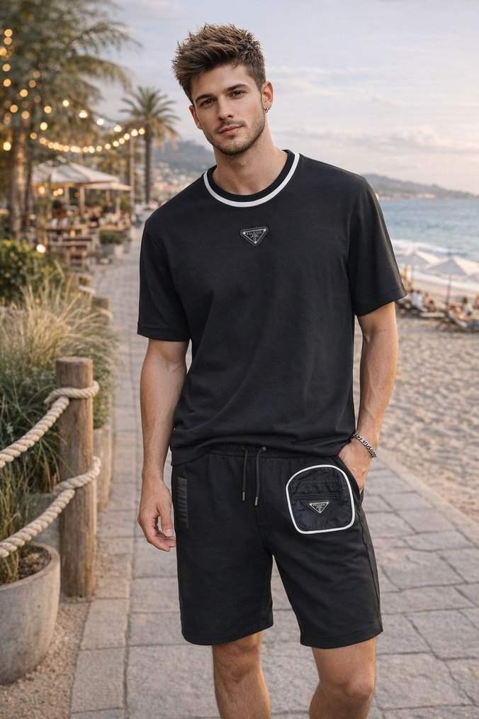 Siyah, oversize kesim pamuklu şort takım, yuvarlak yaka ve kısa kolludur. Rahat ve şık bir dış mekan görünümü sağlar.