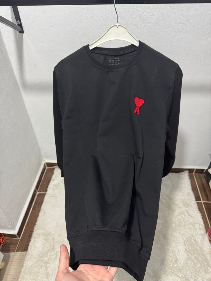 Uzun kollu, yuvarlak yakalı siyah pamuklu sweatshirt. Göğüs kısmında küçük kırmızı kalp baskısı bulunur. Rahat ve şık, günlük kullanım için idealdir. ❤️