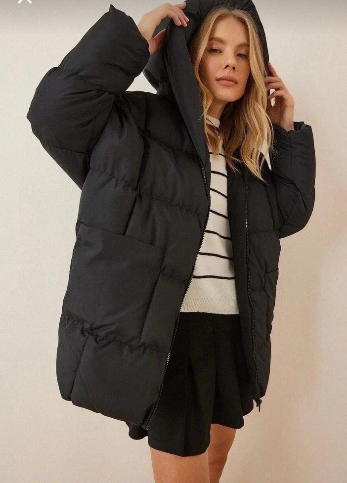 Siyah renkte, yüksek yakalı ve uzun kollu, rahat oversize kesime sahip kadın şişme mont. Yumuşak sentetik kumaştan üretilmiş, günlük sokak stili için uygundur. Sayılı giyilmiştir hiç bir kusuru yoktur sıfır denecek kadar temiz.
