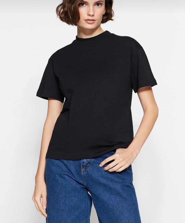 Siyah renkli, yuvarlak yüksek yakalı ve kısa kollu tişört, rahat ve bol kesimiyle gündelik kullanıma uygundur. Yumuşak ve sıcak kumaştan üretilmiştir.