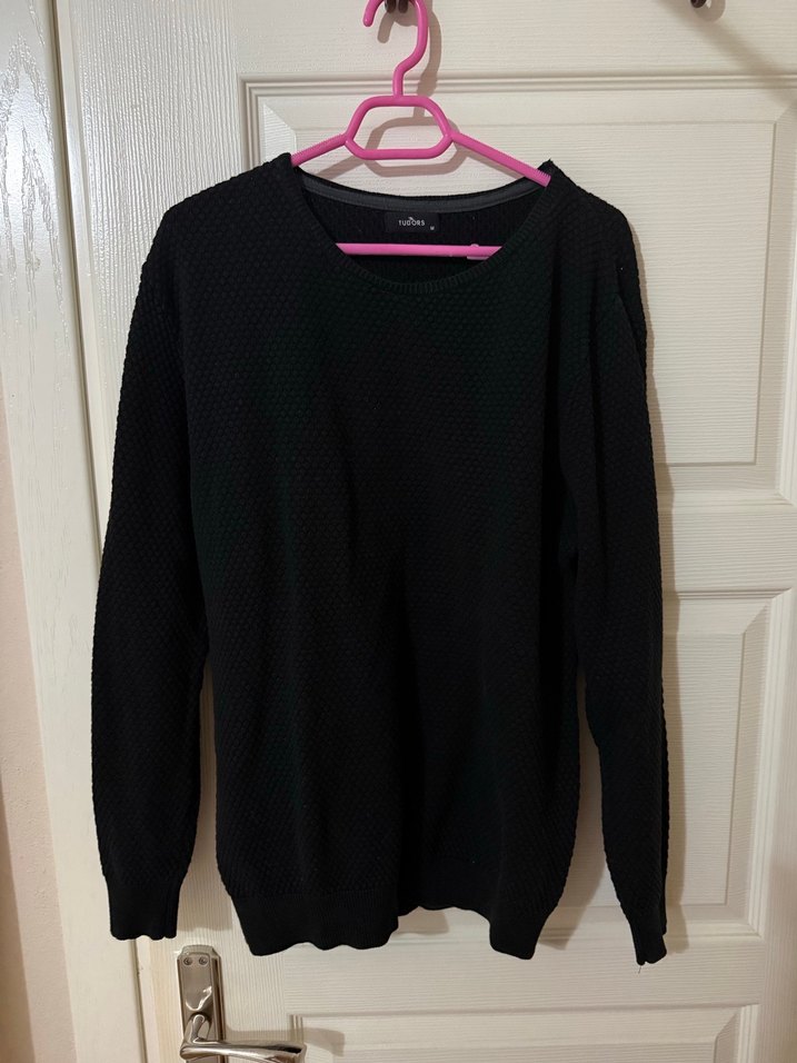Siyah renkli, uzun kollu ve yuvarlak yaka oversize kesim triko kazak. Minimalist ve rahat günlük sokak stili için ideal.