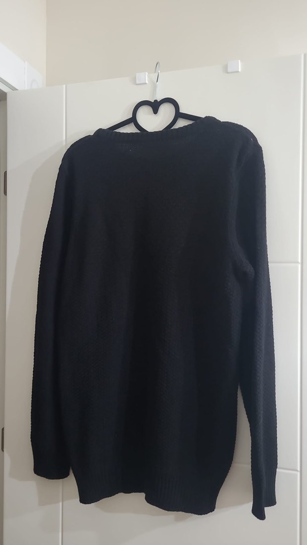 Siyah yün kazak, yuvarlak yakalı ve uzun kollu, bol kesim ve örme dokusuyla minimalist goth tarzda günlük kullanıma uygun.