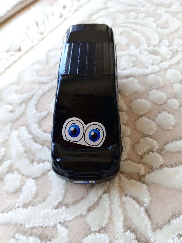 Kaputunda büyük çizgi film gözleri olan siyah oyuncak araba, pürüzsüz malzemeden yapılmıştır.