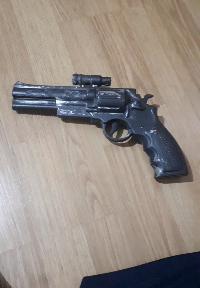 Detaylı tutamaçlı, üzerinde dürbün bulunan siyah oyuncak tabanca.