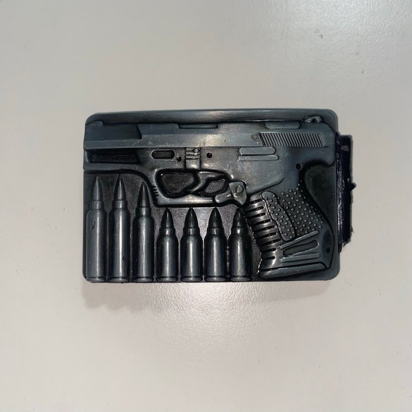 Detaylı mermi figürleriyle siyah oyuncak tabanca şeklinde kemer tokası. Sağlam malzemeden, koyu renkte.