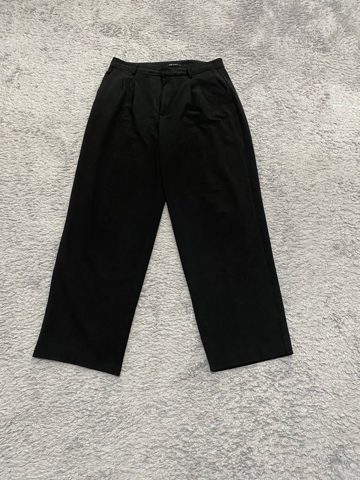 Siyah pamuk kumaştan, normal boy midi kesim, rahat kalıp kadın pantolon. Minimalist ve zahmetsiz şıklık sunar, ofis için uygundur.