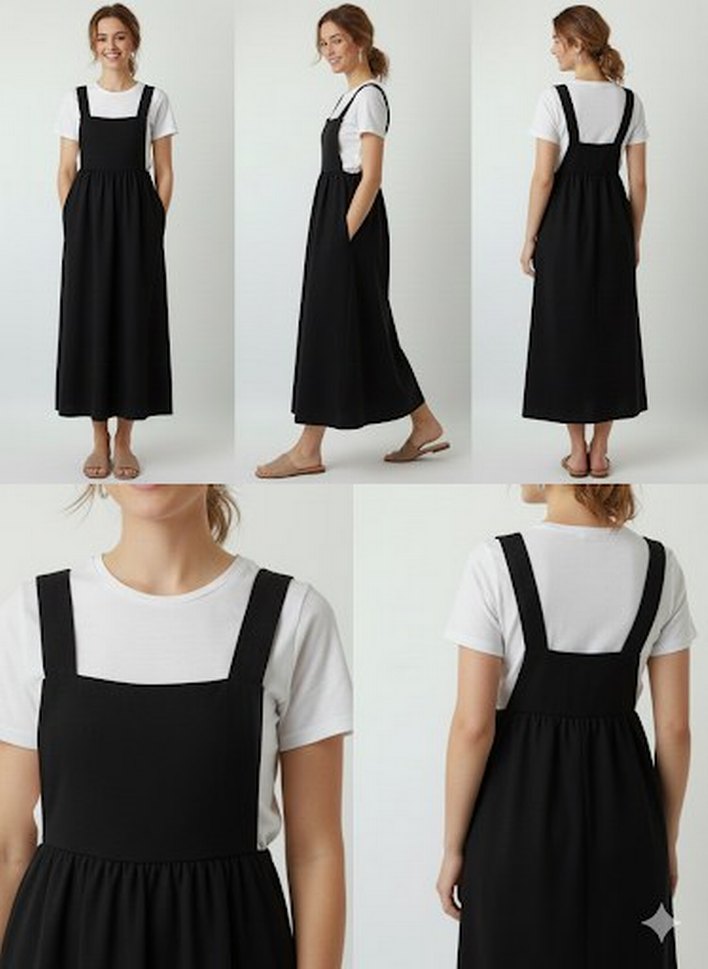 Pamuk kumaştan, askılı, midi boy, bol kesim siyah hamile elbisesi. Günlük kullanıma uygun, rahat ve şık bir seçimdir.
