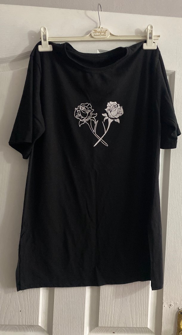 Pamuklu, kısa kollu, yuvarlak yakalı siyah hamile tişörtü, minimalist gül baskılı, rahat ve günlük kullanıma uygun.