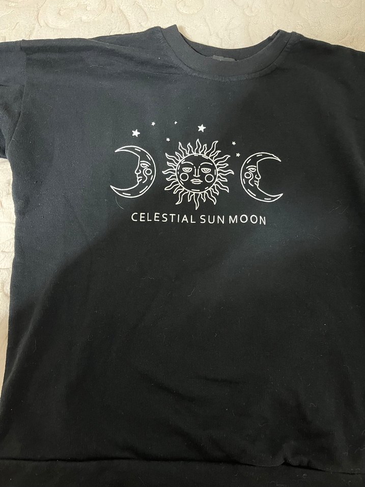 yuvarlak yaka, pamuklu siyah sweatshirt rahat kesim ve göksel güneş ay baskılı.