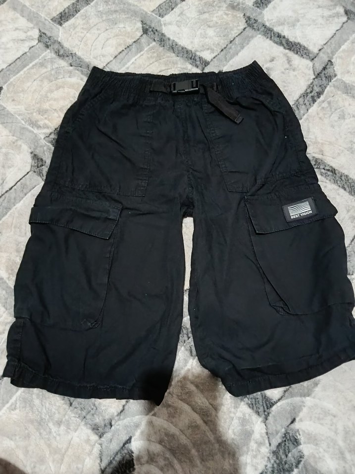 Siyah pamuklu kumaştan, bel bantlı ve bol kesimli midi boy erkek bermuda. Sokak stiline uygun, rahat ve dış mekan kullanımı için ideal.