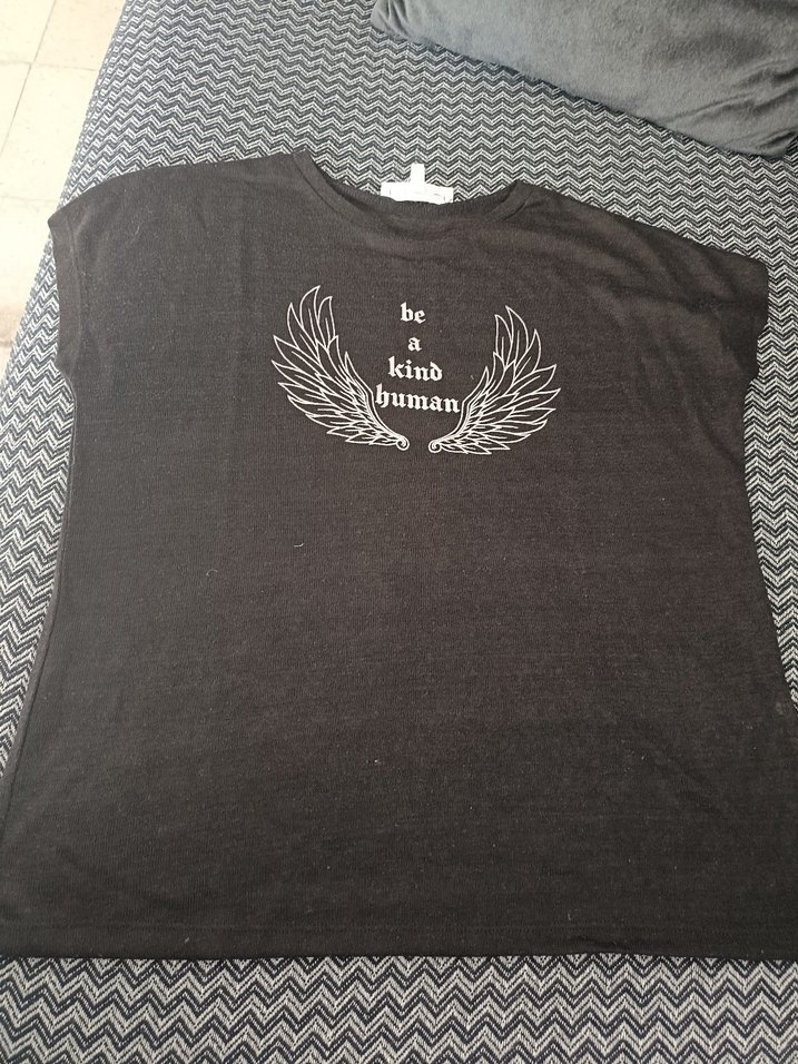 Siyah pamuklu tişört, kısa kollu, yuvarlak yaka ve bol kesimdir. Üzerinde "be a kind human" yazılı kanatlı baskı vardır, günlük kullanıma uygundur.
