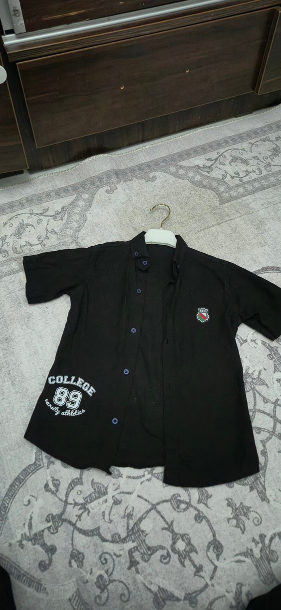 Siyah pamuklu, kısa kollu, yakalı ve düğmeli erkek çocuk gömleği. Bol kesim ve baskılı detaylar içerir, rahat ve şık bir görünüm sağlar.