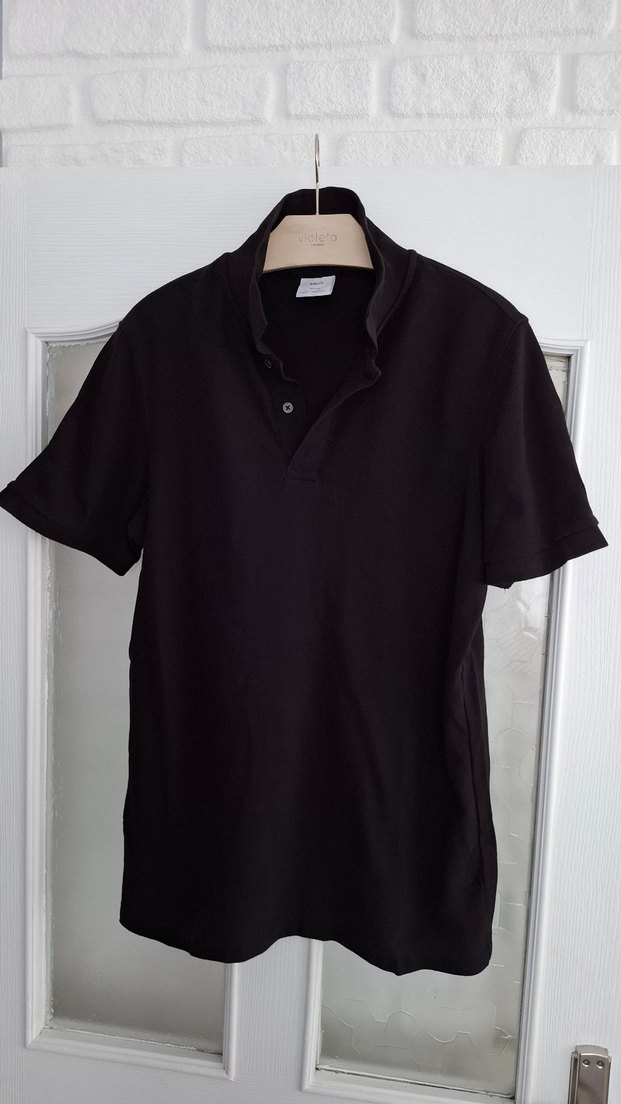 Siyah keten erkek polo tişört, yakalı ve kısa kolludur. Rahat kesimi ve nefes alan kumaşıyla günlük sokak stiline uygundur.