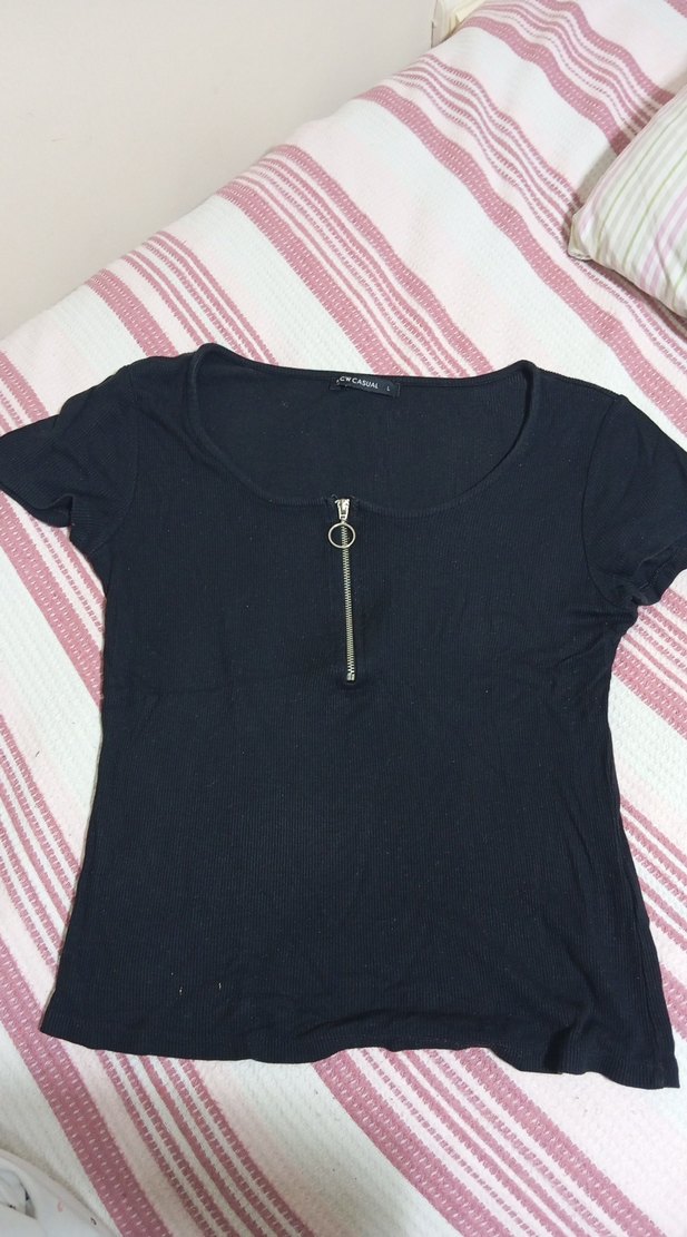 Siyah Pamuklu Fermuarlı Kısa Kollu Kadın Tişört