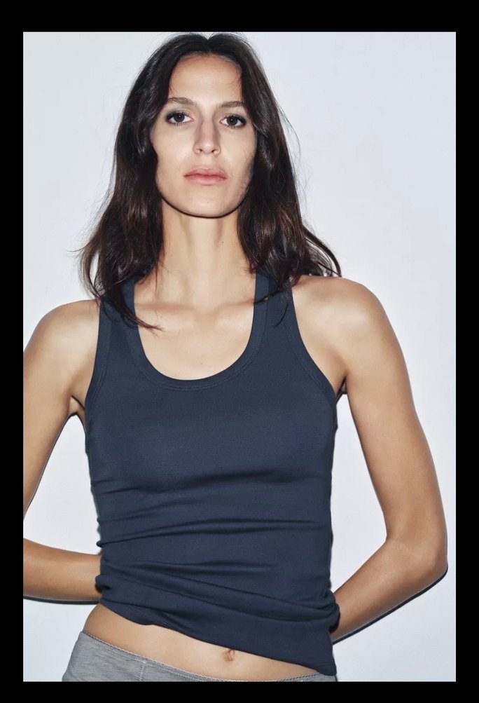 Siyah, yüksek yakalı ve kolsuz, denim kumaştan yapılmış, vücuda oturan normcore tarzı kadın atlet. Günlük kullanıma uygun, zahmetsiz şıklık sunar.
