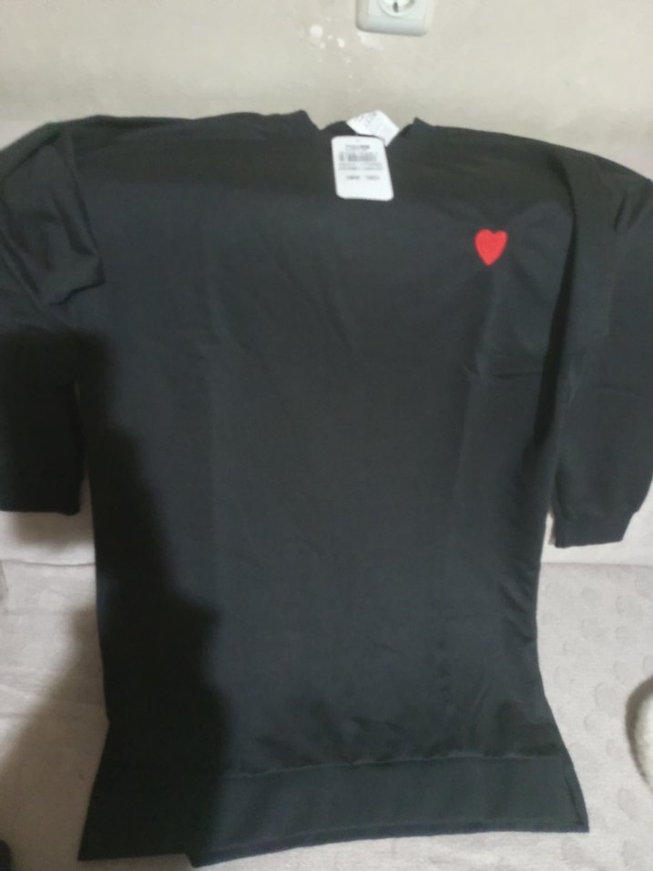 L bedendir. Siyah pamuklu, yuvarlak yaka ve kısa kollu kadın tişörtü. Salaş kesim, normal boyda ve küçük kırmızı kalp baskılıdır. Günlük kullanıma uygun, rahat ve şık. ❤️
