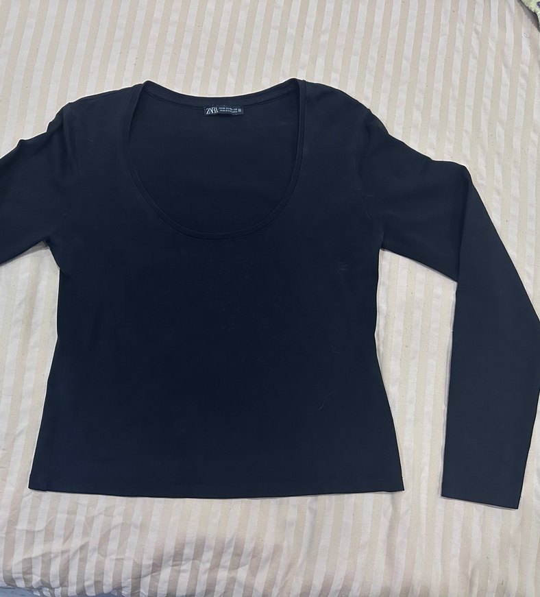 Siyah, uzun kollu, tek renk ve pamuklu kumaştan yapılmış mini fitted bluz. Minimalist tasarımıyla günlük kullanım için zahmetsiz şıklık