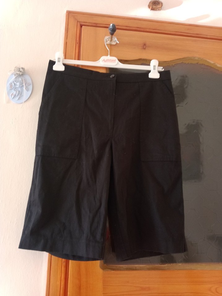 Siyah pamuklu, kemerli, bol kesim kadın bermuda şort. Kısa boy, minimalist tarzda günlük sokak giyimi için uygun.