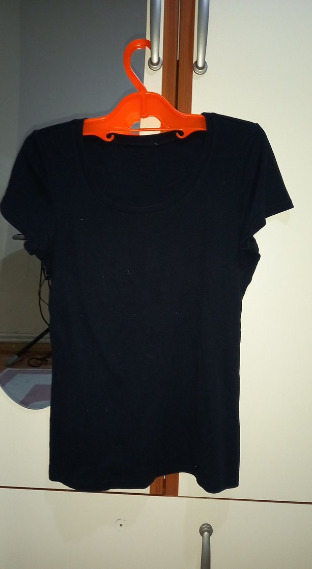 Pamuklu kumaştan yapılmış, kısa kollu ve bisiklet yaka siyah hamile tişörtü, rahat ve şık bir günlük kullanım ürünü.