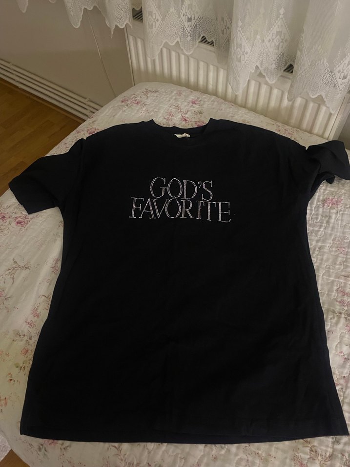 Siyah pamuklu kız tişörtü, kısa kollu ve yuvarlak yakalıdır. Dantel detaylı ve 'GOD'S FAVORITE' baskılıdır. Gevşek kesimlidir.