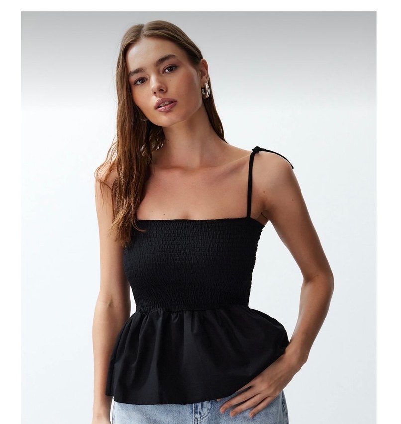 siyah pamuklu poplin detaylı fitted askılı bluz