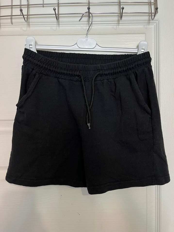 Siyah pamuklu, elastik bel ve cepli rahat kesim mini şort, trend sokak stili için uygundur.