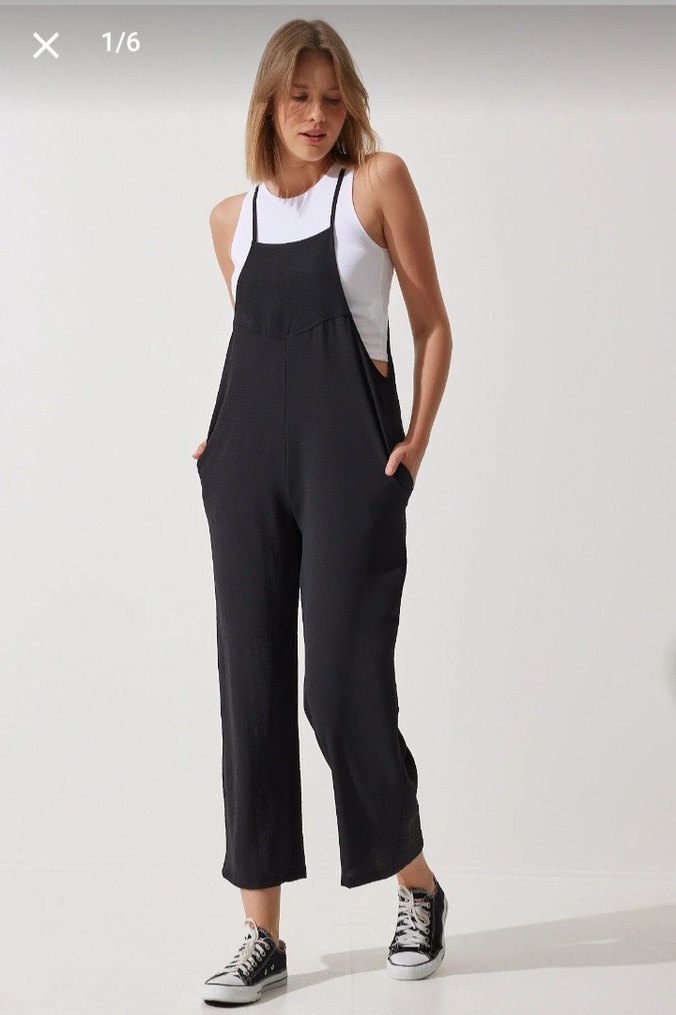 Siyah pamuklu kumaştan, salaş kesim, askılı tulum. Günlük kullanıma uygun, rahat ve şık bir sokak stili parçası. 38 40 bedene uygundur.