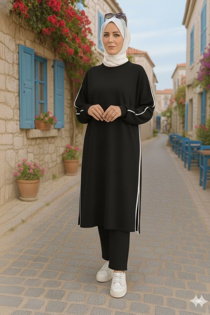 Siyah pamuklu, uzun kollu ve drapeli kadın takımı. Etnik desen detaylarıyla gündelik sokak stiline uygun, regular fit ve bisiklet yaka.