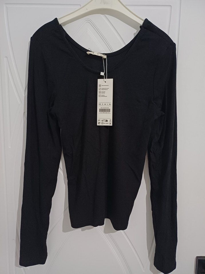 Siyah pamuklu bluz, uzun kollu ve yuvarlak yakalıdır. Vücuda oturan midi boy kesimiyle günlük rahatlık ve şıklık sunar.