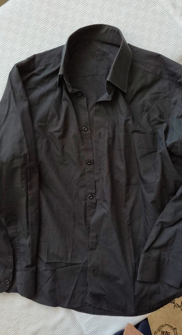 Siyah, düğmeli ve yakalı uzun kollu erkek gömleği. Normal kesim ve sade tasarımıyla ofis kullanımı için uygundur. renkte hiç bir sorun yok resimde parlamış yerler için yazıyorum
