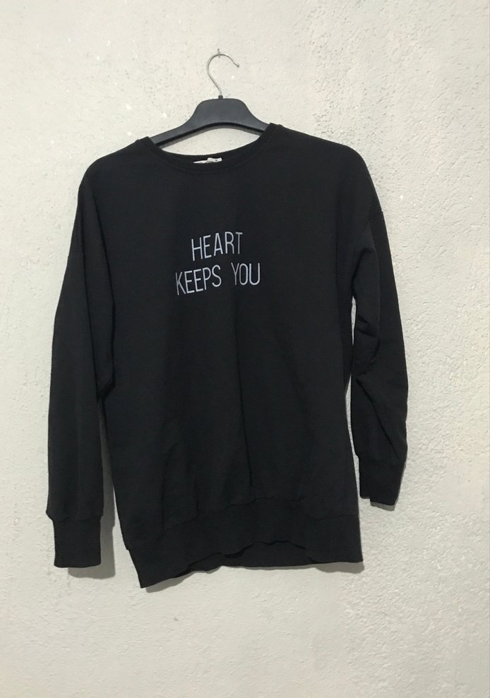 Siyah pamuklu, uzun kollu, bisiklet yaka sweatshirt. Gevşek kesim ve "HEART KEEPS YOU" baskılı, örme dokulu, günlük kullanıma uygun. ❤️