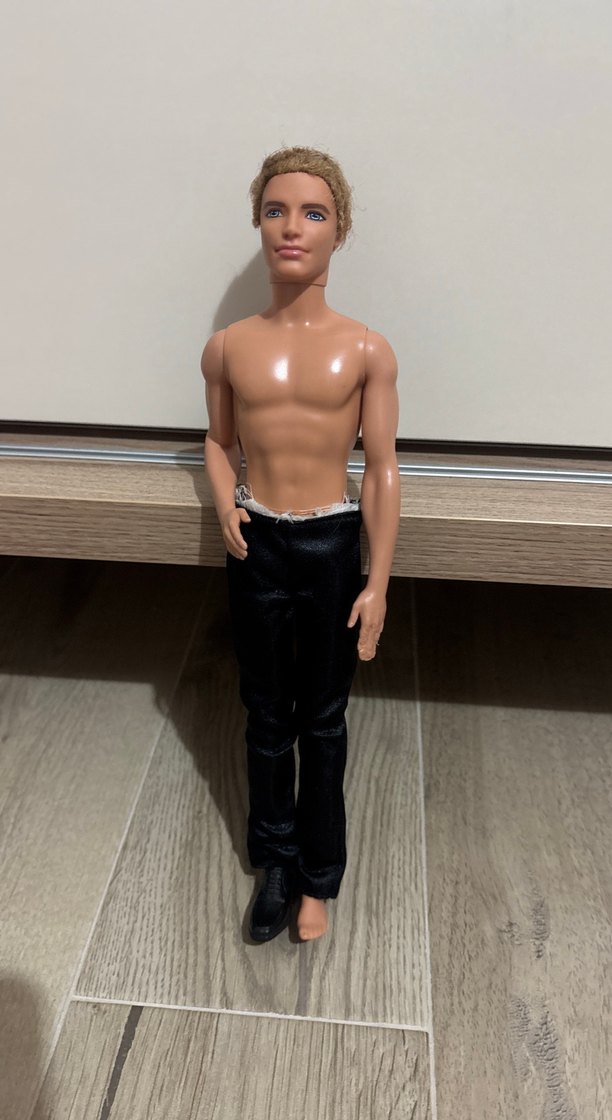 Koyu sarı saçlı erkek bebek oyuncak, siyah pantolon ve siyah ayakkabı giymiş, üstü çıplak. ayakkabisinin esi kayip pantolonu var gömleği yok saci biraz kotu durumda