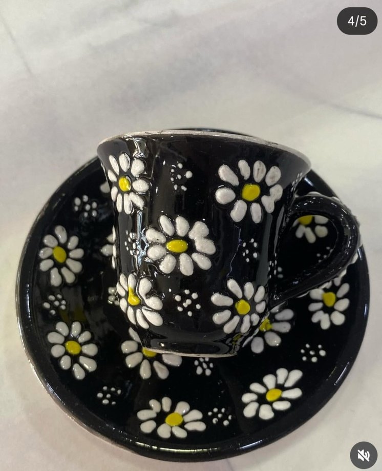 Beyaz ve sarı papatya desenleriyle süslenmiş siyah fincan ve tabağı, içecek sunumu için uygundur. ☕ kütahya çinisi olup el yapımıdır