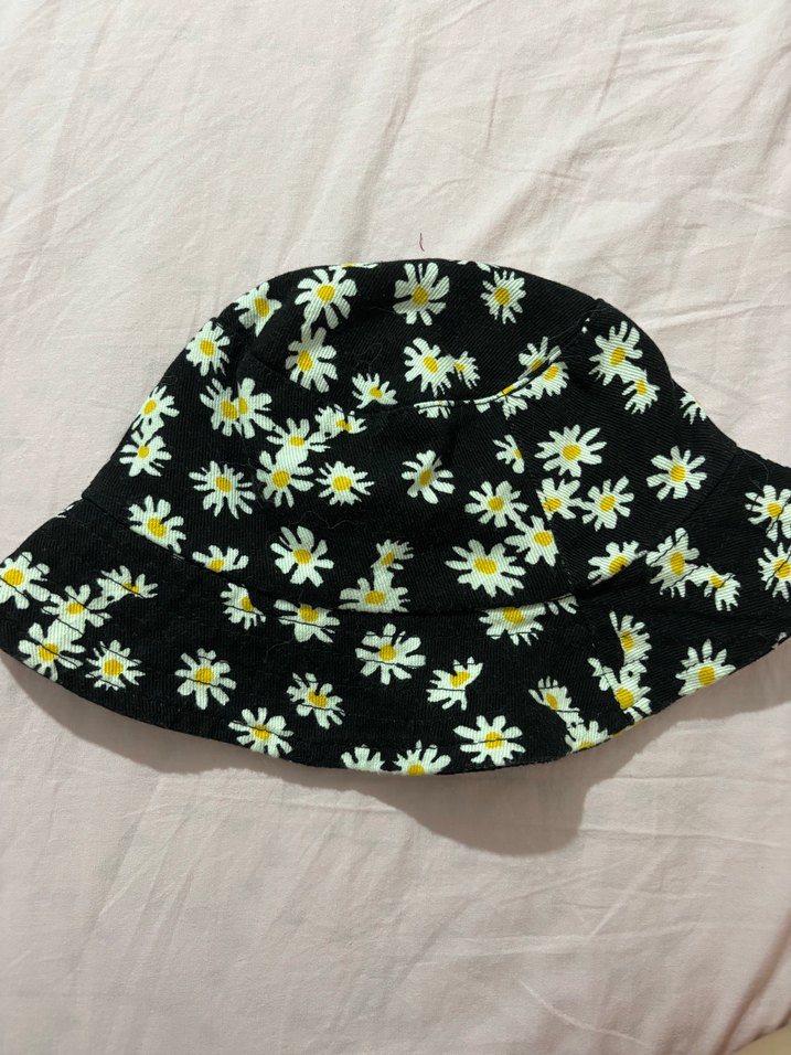 Siyah zemin üzerine renkli papatya desenleri ve fırfırlı kenarları olan, yumuşak sentetik kumaştan yapılmış rahat, retro tarzda kadın şapkası.