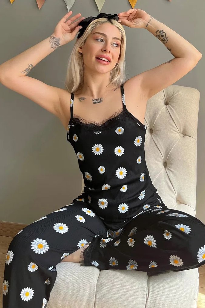 Siyah renkli, uzun askılı ve bol kesim kadın pijama takımıdır. Üzerinde papatya desenleri bulunur, rahat ve şık bir sokak giyimi tarzındadır.