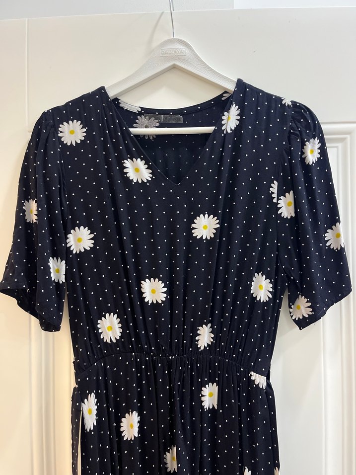 Siyah dizaltı elbise, rahat kesim, kısa kollu ve V yakalıdır. Düğmeli ön kısmı ve puantiyeli zemin üzerinde papatya desenlidir. Kendi kumaşından kemeri mevcuttur. Ürün L bedendir. Herhangi bir deformesi yoktur.