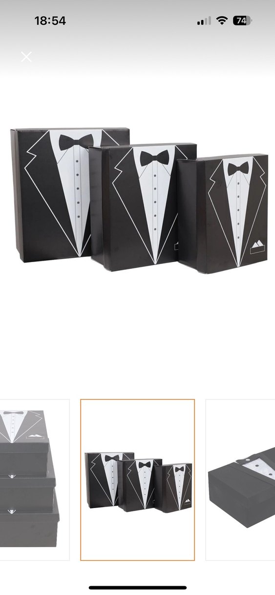 Damat temalı, papyon baskılı siyah hediye kutuları seti. Modern klasik tarzıyla düğünler için uygun.