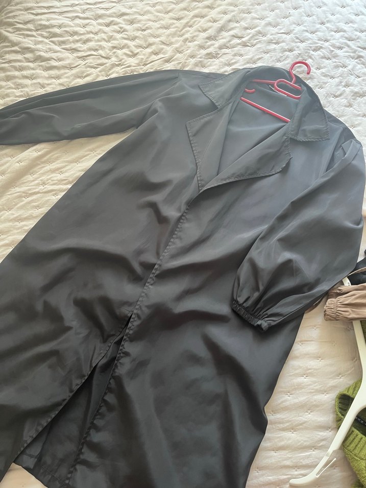 Siyah renkte, uzun kesim ve salaş fitli trençkot Notlu yaka ve drapeli tasarıma sahip, uzun kollu, sentetik kumaştan üretilmiştir. Günlük kullanıma uygundur.