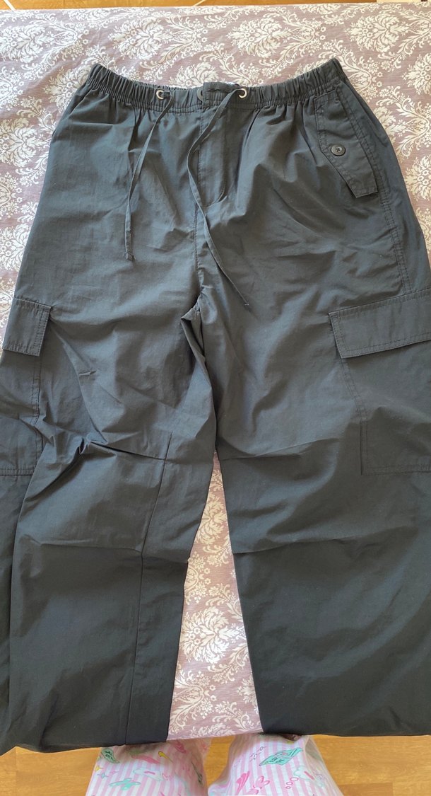 Siyah renkte, yan cepli, rahat kesim kadın pantolon. Sentetik kumaştan üretilmiştir, günlük dış mekan kullanımı için uygundur.