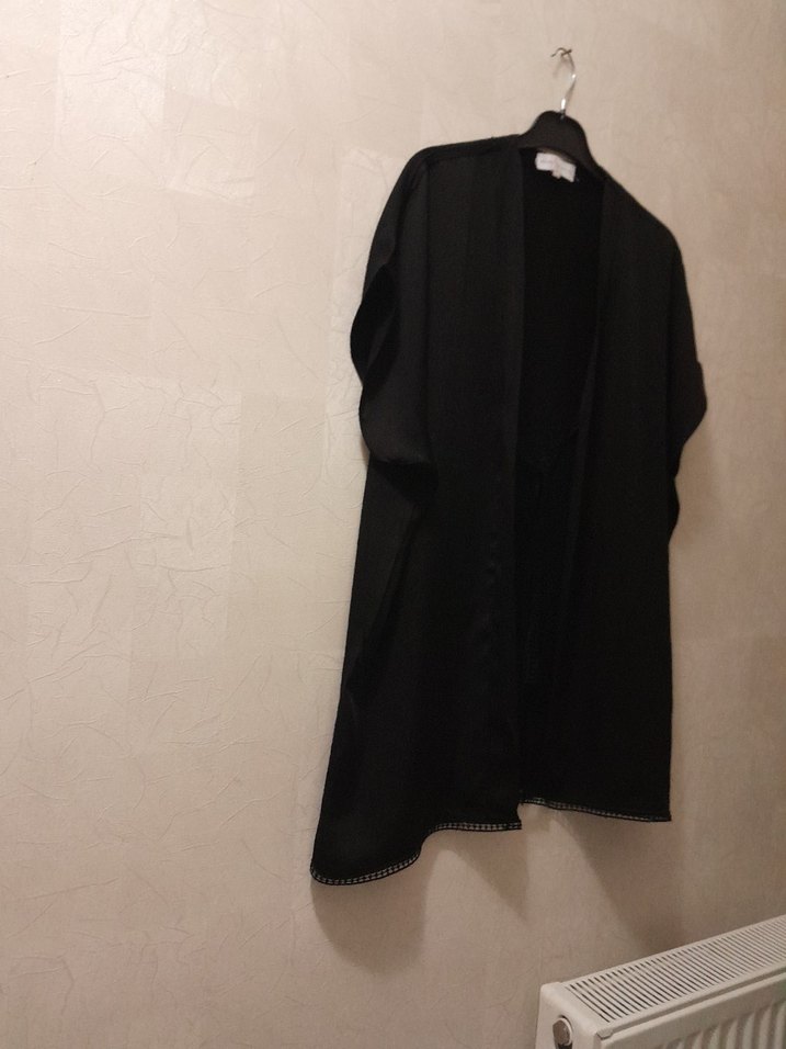 siyah renkli,ince parlak bir kumaş,XL beden,alt eteğinde ve bağlama ipinde ince dantel detayı var,çok hoş bir pareo,bir iki kez giyildi tertemiz yıkandı ütülendi satışa sunuldu hiçbi deforme yıpranma yok,ölçüleri iki koltuk arası 60cm boyu 77cm.