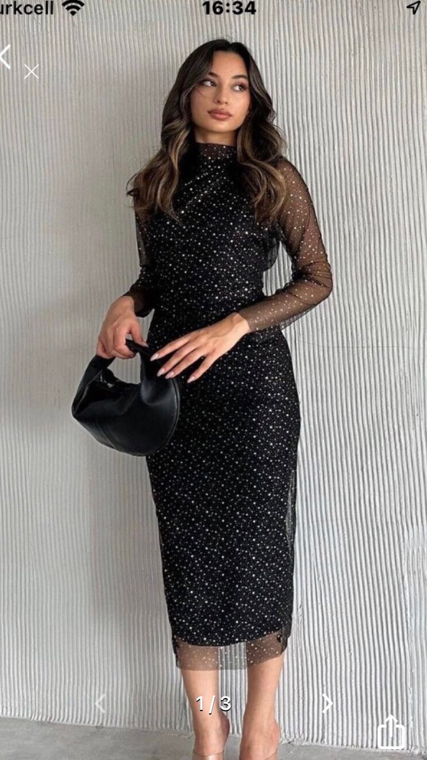 Yüksek yakalı, puantiyeli payet desenli, siyah uzun ve vücuda oturan elbise. Boyu118 tülle127 cm, kol altı 47-47 cm. Fermuarsız bir modeldir. XL bedendir ama L bedene daha rahat olabilir. Elbise bir sefer giyilmiştir.