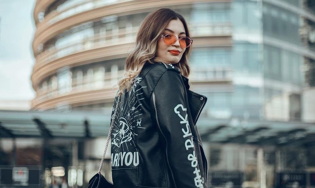 Siyah parlak deri ceket, baskılı desenlerle, askısız yaka ve uzun kollu. Bol kesim ve midi boy, rock punk havasında sokak stiline uygun. "ARYOU" yazısı bulunur.